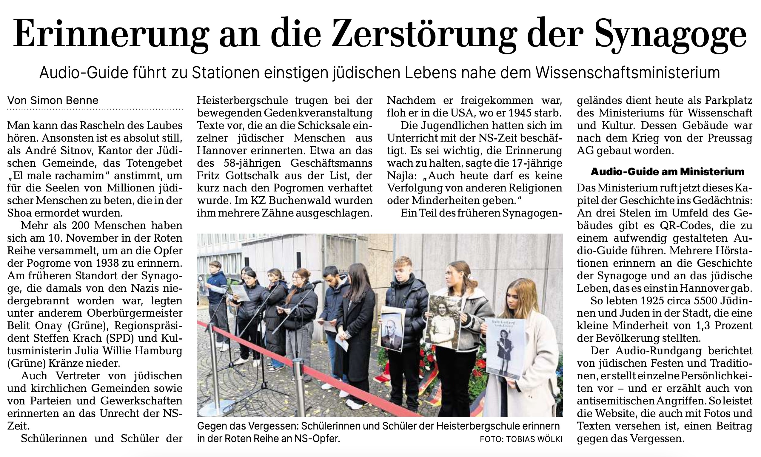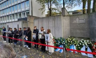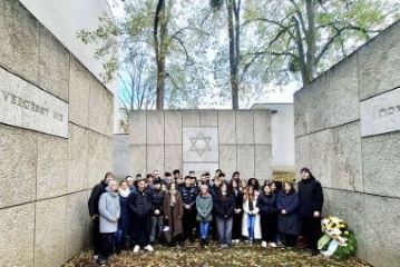 Am 10. November 2025 nahm der 10. Jahrgang anlässlich des Gedenktages zur Erinnerung an die Pogromnacht von 1938 bei der offiziellen Gedenkveranstaltung am Mahnmal der früheren Synagoge in der Roten Reihe teil.